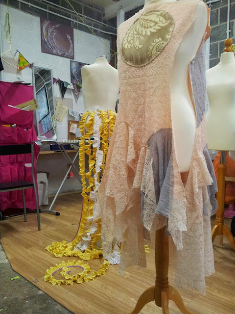 Yesterday I added a lace up fastening to the jelly fish dress, and added further lace to the ruffle collection. The next stage is to join them together!