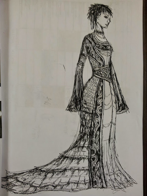 I'm currently working on a show at the Victoria baths in Manchester, an old swimming pool. It's a beautiful building with lovely stained glass windows and poolside changing cubicles. I have to spend 45 minutes during each show hiding in a cubicle in order to help with a quick costume change- so I've decided to challenge myself to design a dress/costume every day in order to occupy the other 44 minutes in which I'm stuck there! This should pass the time quickly as it's now a race against the clock, and keeps me feeling creatively inspired.